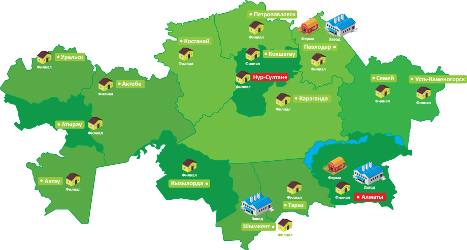 Филиалы и заводы компании FOODMASTER в республике Казахстан